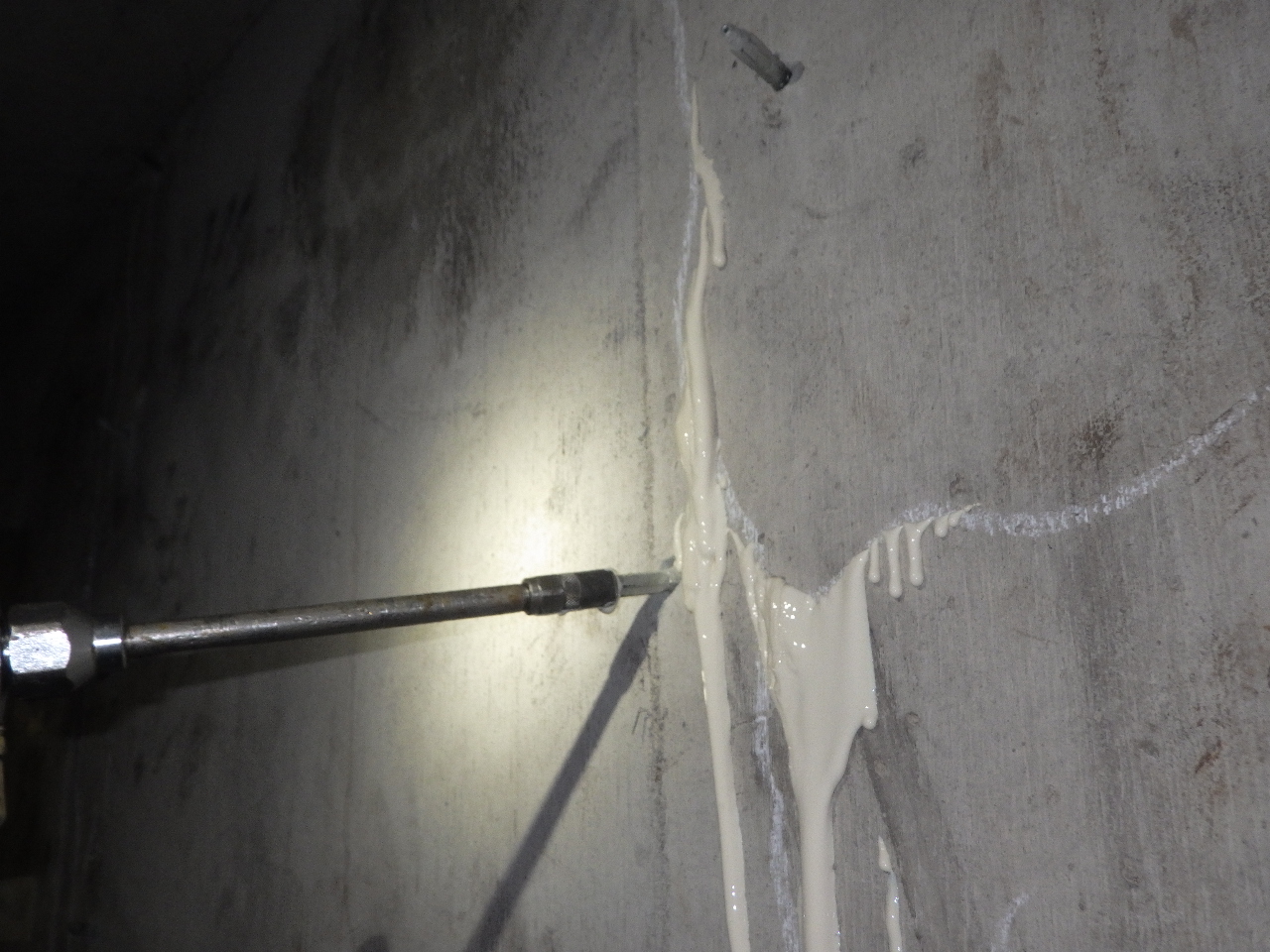 地下コンクリート構造物における漏水原因(ひびわれ・打継・セパレータ跡・ジャンカ等)からの未出水部分を含むすべての漏水原因から注入剤を逆流浸透させることで、その内部に注入剤を充填・閉塞するとともに、躯体裏面に新たな防水層を形成することを目的とした工法です。